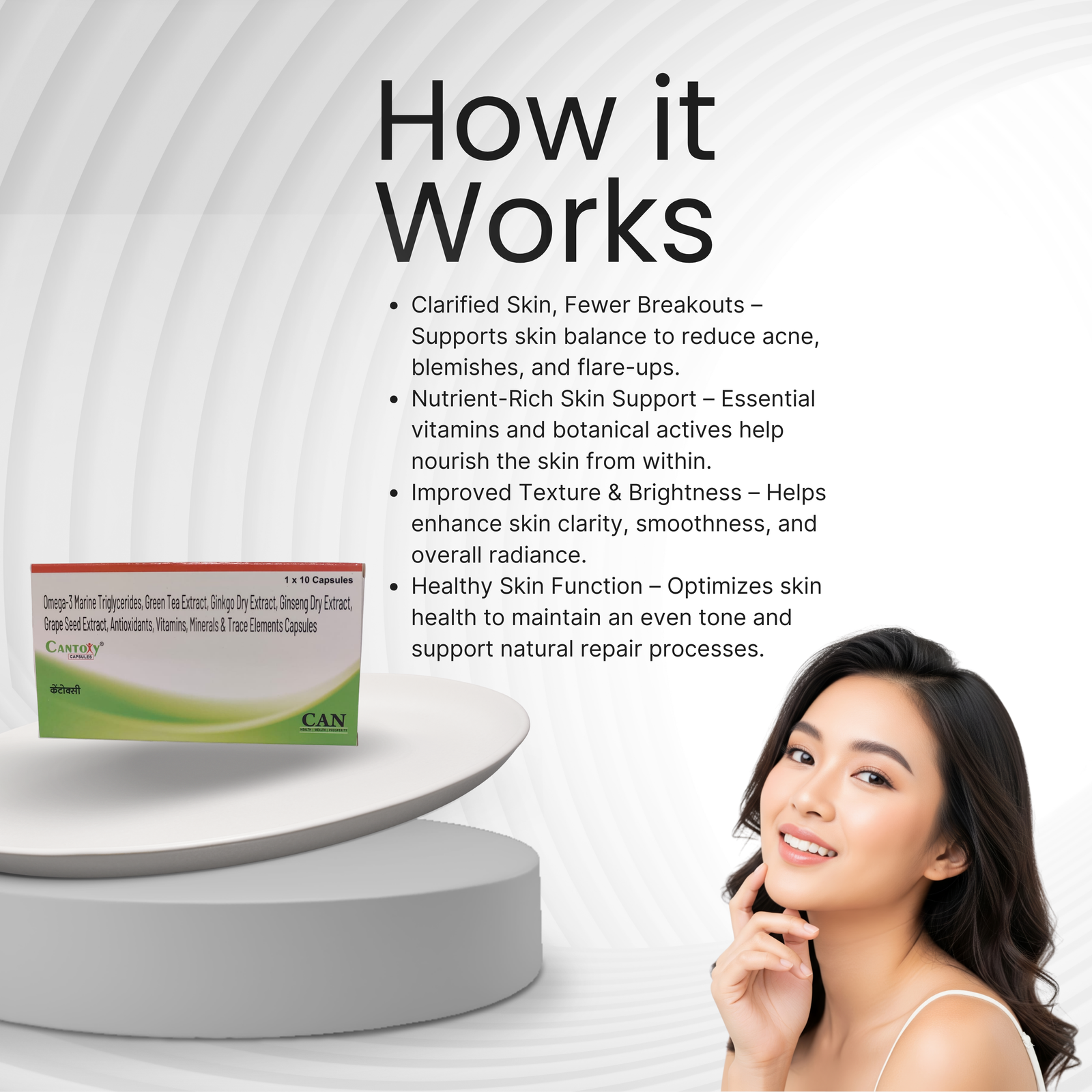 • Oral supplement designed to support clearer, balanced, and acne-free skin